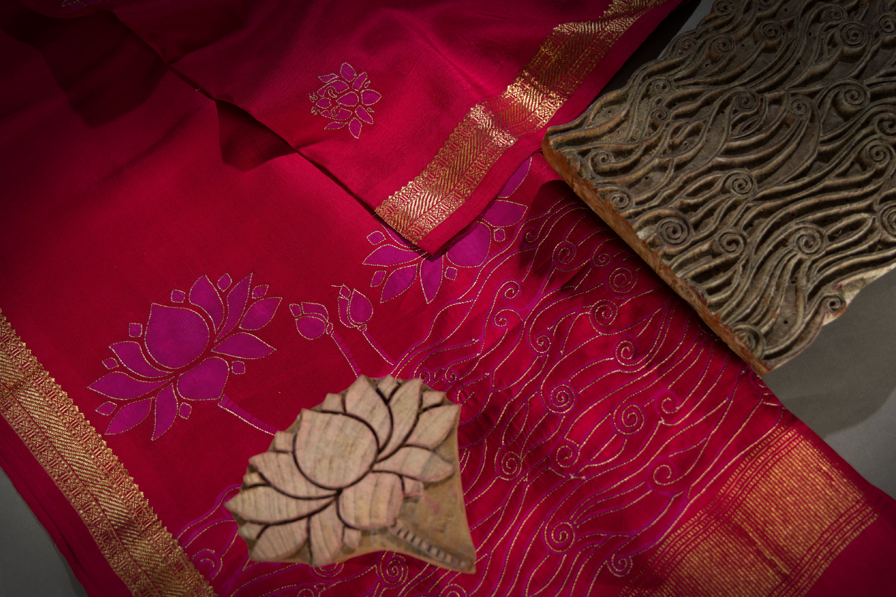 Discover a vibrant collection of exquisite kanjivaram silk saris embellished with block prints inspired by motifs of the craft, as well as delicate hand embroidery.